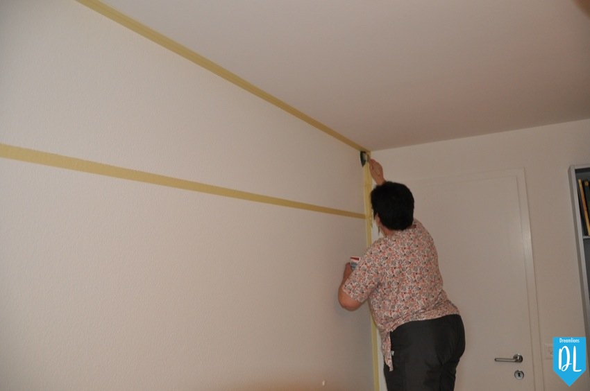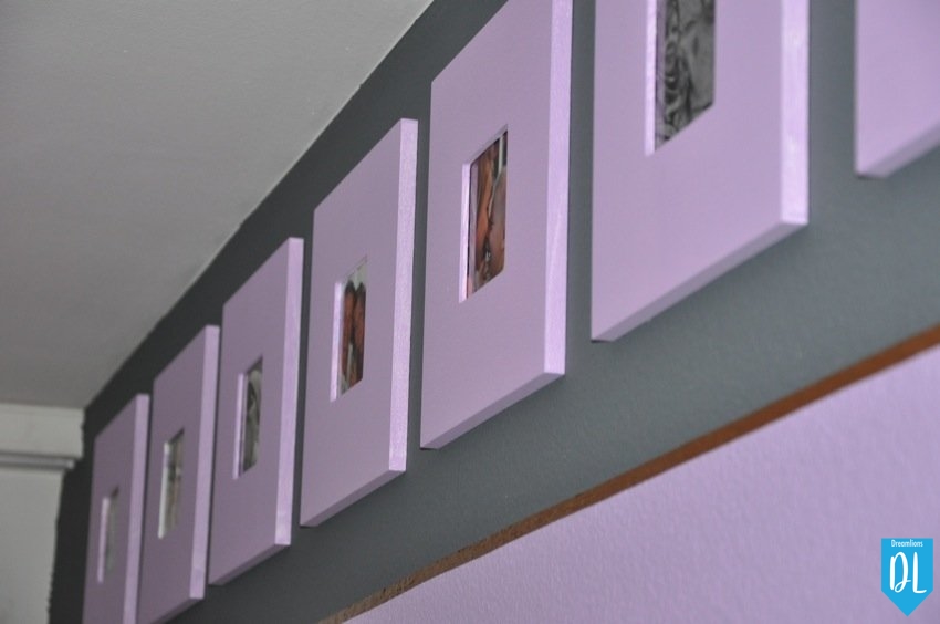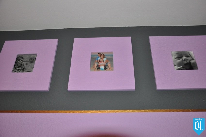 Heute starteten wir gemütlich. Bis am Mittag hatten wir lediglich den Streifen aus goldiger Folie (damit der Übergang der beiden Farben nicht so heftig wirkt) montiert, sowie die genaue Anordnung der Bilder definiert. Sicherheitshalber hatten wir ja 2 Bilderrahmen mehr gekauft, da wir noch nicht ganz sicher über die genaue Anordnung, resp. deren Stückzahl waren.
