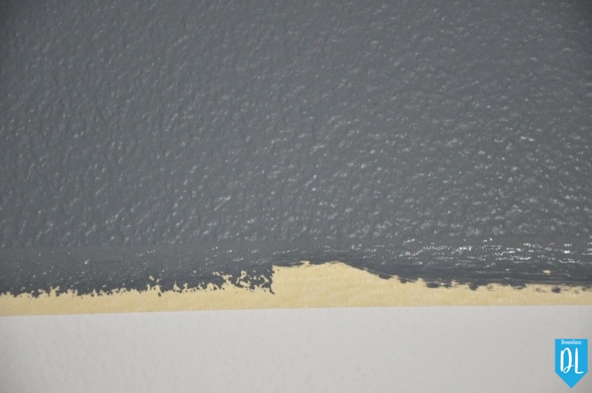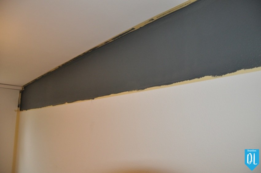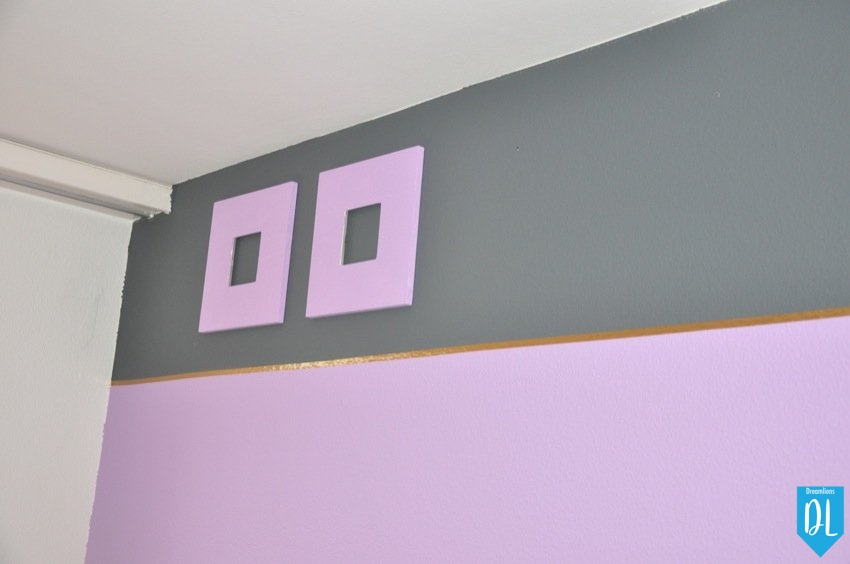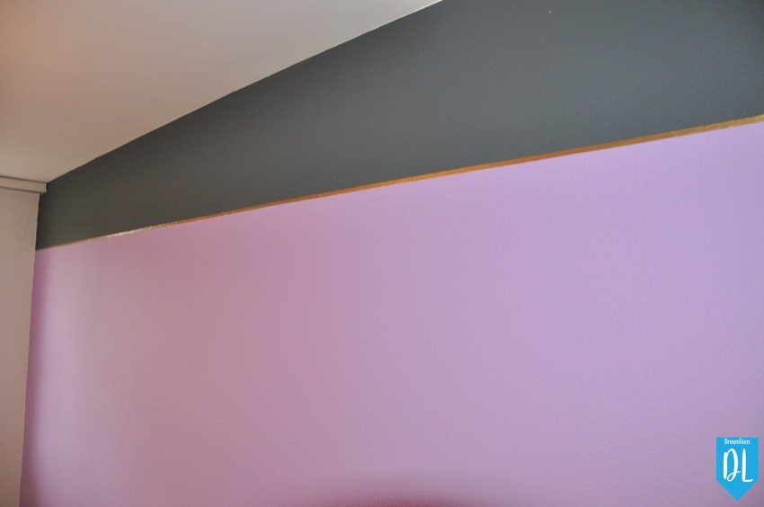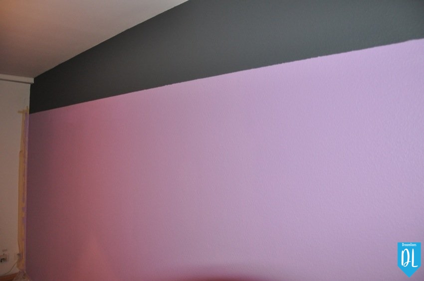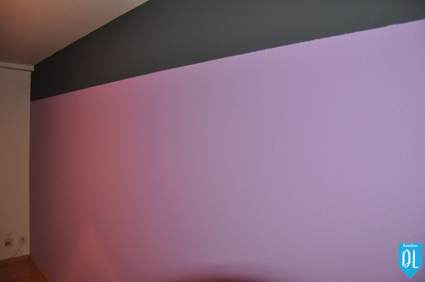 Im ersten Schritt haben wir nun die „grosse“ Wand zweifarbig angemalt. Den unteren Teil erstrahlt nun in „flieder“ und der obere Teil in „eisengrau“. Grau in einem Kinderzimmer? Warum nicht?! Die Kombination dieser beiden Farben ist super! Dazu kommt, dass es erst der erste Teil ist der Neugestaltung ist.