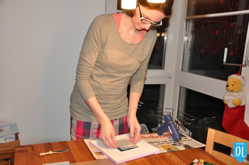 Danach musste Yael die Fotos für in die 12 Bilderahmen aussuchen. Nachdem wir am Nachmittag die Fotos entwickelt hatten ging es erst am Abend weiter. Natascha leimte die Bilderrahmen mit der Heissleimpistole wieder zusammen und Yael überlegte sich die Reihenfolge der Bilder wie sie schlussendlich an der Wand montiert werden.