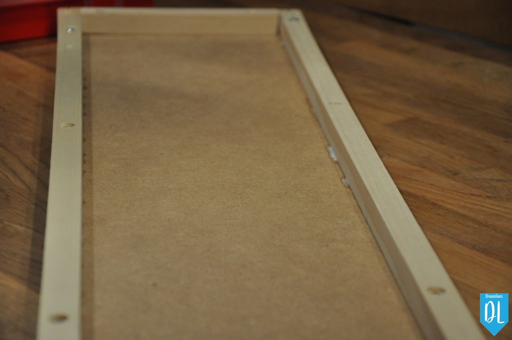 Zuerst mussten wir das Vierkantholz auf das MDF schrauben/ leimen, damit später ein Hohlraum für die Kabelführung vorhanden ist.