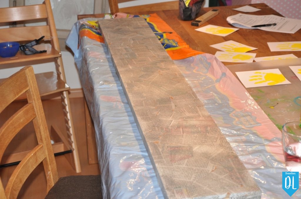 Als nächstes hatte Natascha das Holz mit Zeitungsschnipsel beklebt. Nach dem trocknen konnte dieses mit weisser Farbe bemalt werden (nicht deckend).