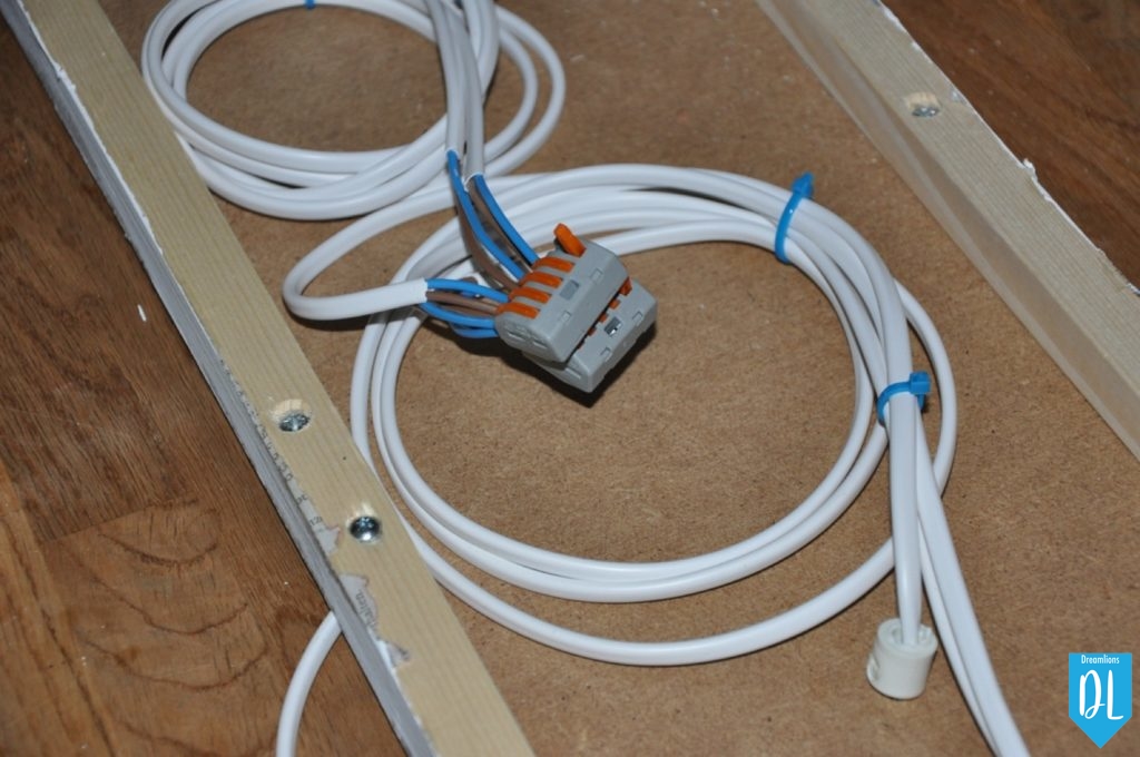 Als letzten Schritt musste ich nur noch die Leuchte komplett verdrahten. Dank dem Hohlraum im Holz hatte ich genügend Platz um die Klemmen darin zu versorgen. Als Leuchtmittel wählten wir energiesparende LED. Fertig!
