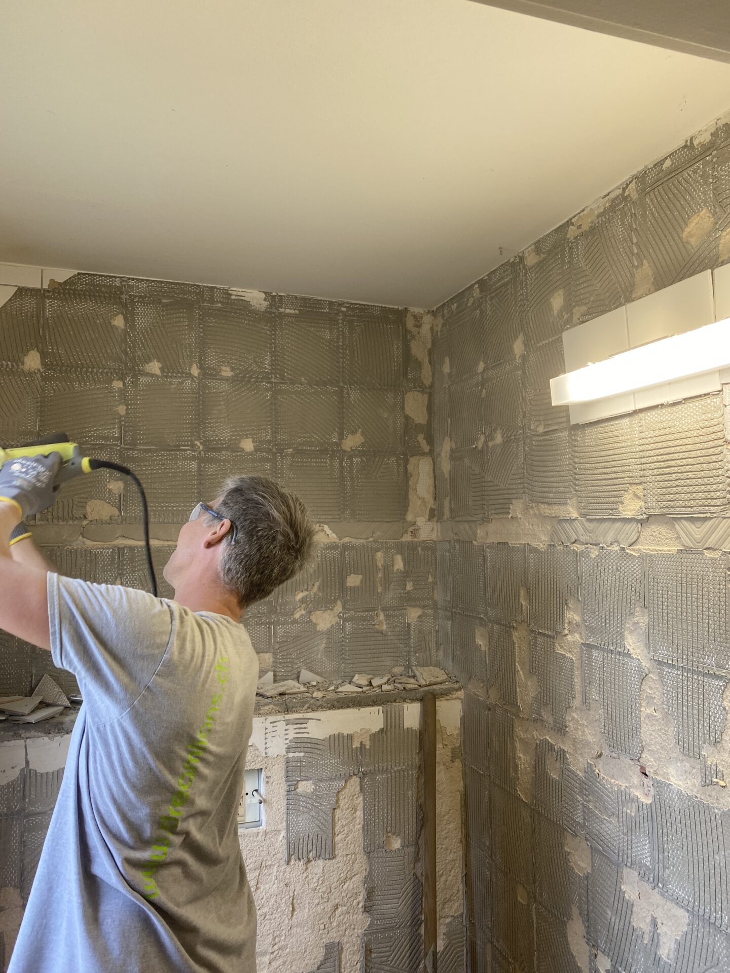 Heute hat Oli den Kampf den Wandfliessen im Gäste- WC angesagt – und gewonnen… Im nächsten Schritt wird noch der Fliessenkleber entfernt.
