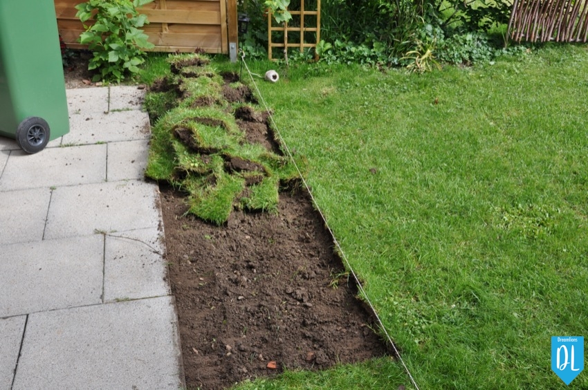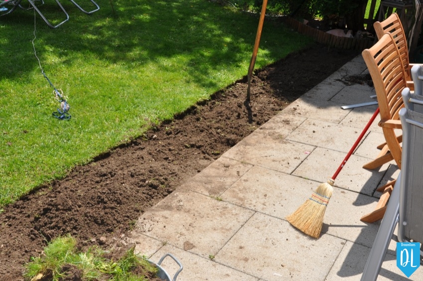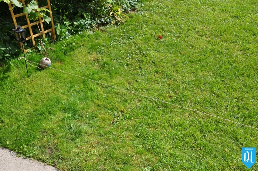 Wie bereits oben erwähnt, heute um 10.00 Uhr hab ich zusammen mit Yael begonnen den Rasen abzustechen. Unser neuer Sitzplatz soll ja 60cm tiefer werden als der alte. Dafür hab ich einen Schnurschlag erstellt, damit die Kante auch wirklich gerade wird und ich nicht nach jedem Spatenstich neu messen muss.